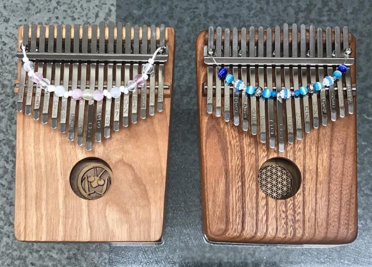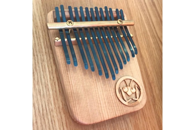 無垢ひのきの風合いが、同じく無垢材を使ったカリンバとよく馴染みます。カマキリがカリンバの穴の中からこちらを覗いているようで、かわいらしいアクセントになっています。