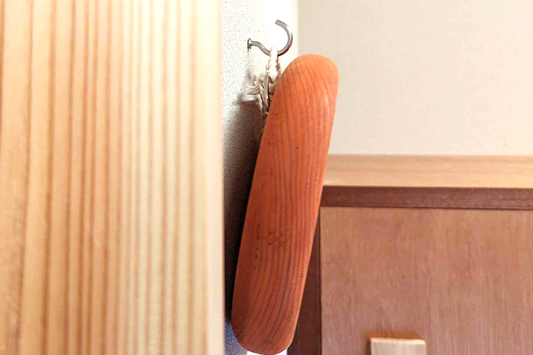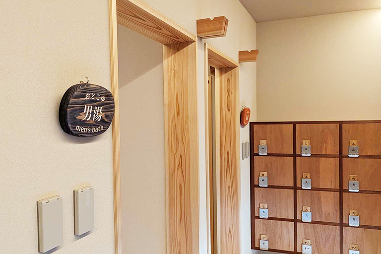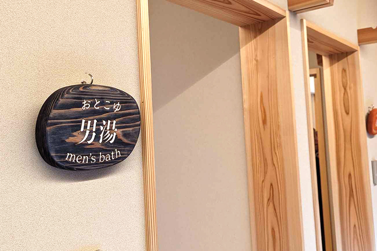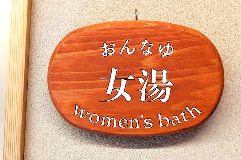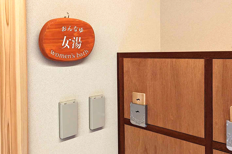 施設の利用状況に応じて男湯・女湯のプレートを簡単に掛け替えられるよう、裏面に金具と紐を付けています。