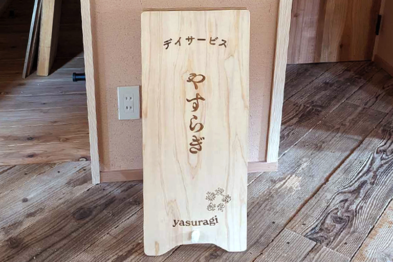 強度のあるひのき合板材に、ロゴデザインをレーザー彫刻し、組み立てています。ロゴの細かい部分まで見やすいよう、深く彫刻しました。